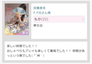 昨年、リニューアルオープンしたということで 遊びに行かせて頂きましたが サービス内容は他の店舗とさほど変わらないかなという印象ですが 今回指名したもかさんのルックスレベルが高すぎてびっくりしました。 性格も優しく、こちらの要望を聞いてくれました。 今後は人気が出て予約が取りづらくなってしまいそうなので コメントを控えようかと思いましたが 我慢できずに書いてしまいました・・・ それほどいい女性だと思います!