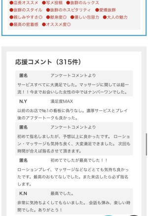 ローションプレイ、マッサージなどなどとても気持ち良かったです。最高のおもてなしでした。また来店したら必ず指名します。